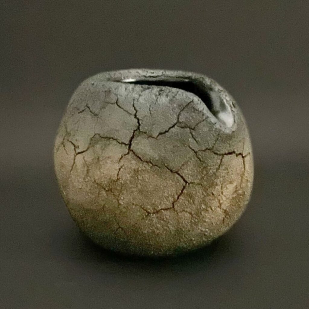 ひび割れは 失われつつあるときめきであり ゆったりと流れる時の象徴でもある。器に刻まれた割れ目はただの傷ではなく 心を静かに震わせ忘れていたときめきを呼び覚ます自然の揺らぎであり その美は月が水面に映るように 時の流れを映し出している。