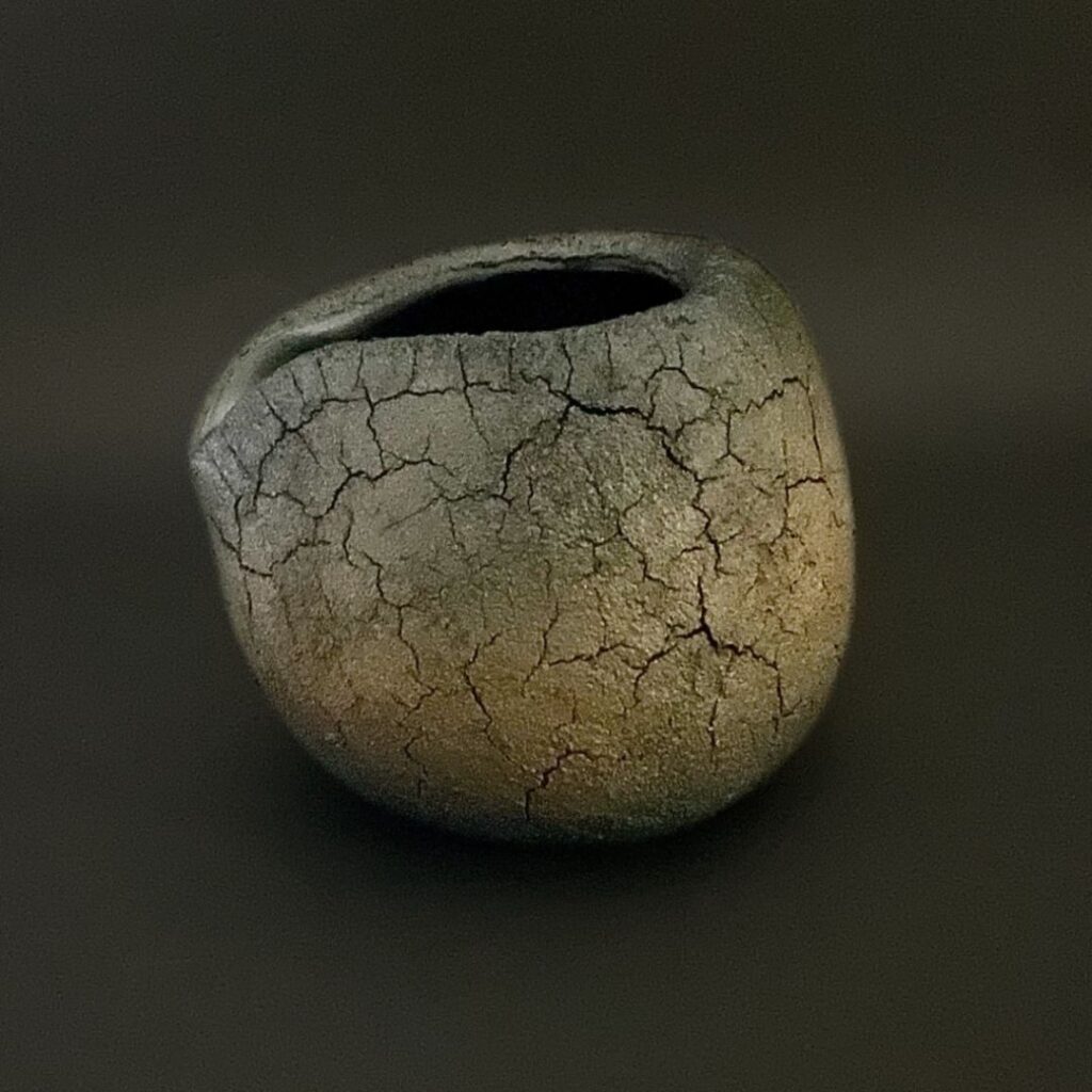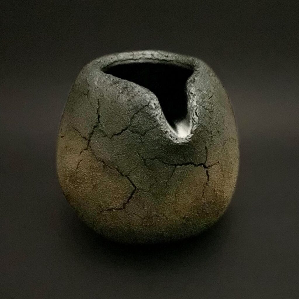 ひび割れは 失われつつあるときめきであり ゆったりと流れる時の象徴でもある。器に刻まれた割れ目はただの傷ではなく 心を静かに震わせ忘れていたときめきを呼び覚ます自然の揺らぎであり その美は月が水面に映るように 時の流れを映し出している。