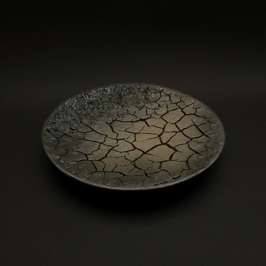 乾ききった大地のように深く走るひび割れと 荒れた質感の中に静かな美を宿したプレート皿。崩れゆく姿にこそ美しさを見出す侘び寂びの心を移し 古い時代から続く「不完全の中に潜む永遠の美」を現代に表現しています。荒寂の表面と静謐な余白が交差する姿は 時の流れを映し出す大地の詩のように 使う人の感性にそっと語りかけます。料理を盛る器としてはもちろん アートピースとして空間に飾れば静かで確かな存在感を放ちます。
